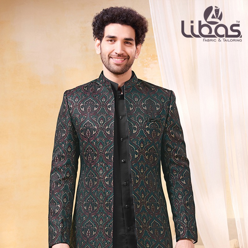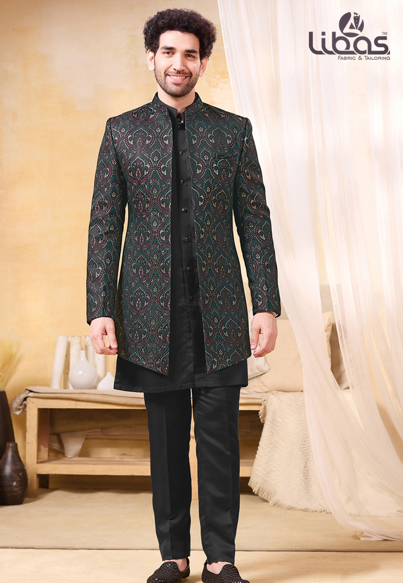 REGAL SAGE EMBROIDERED 3 PIECE OPEN INDO WESTERN SET FOR MEN