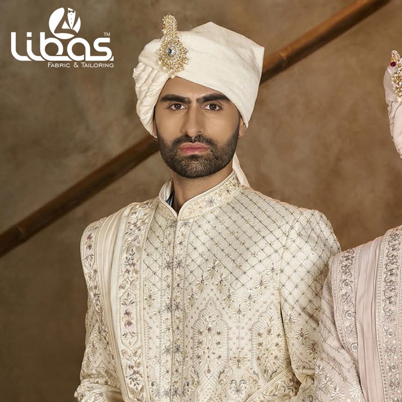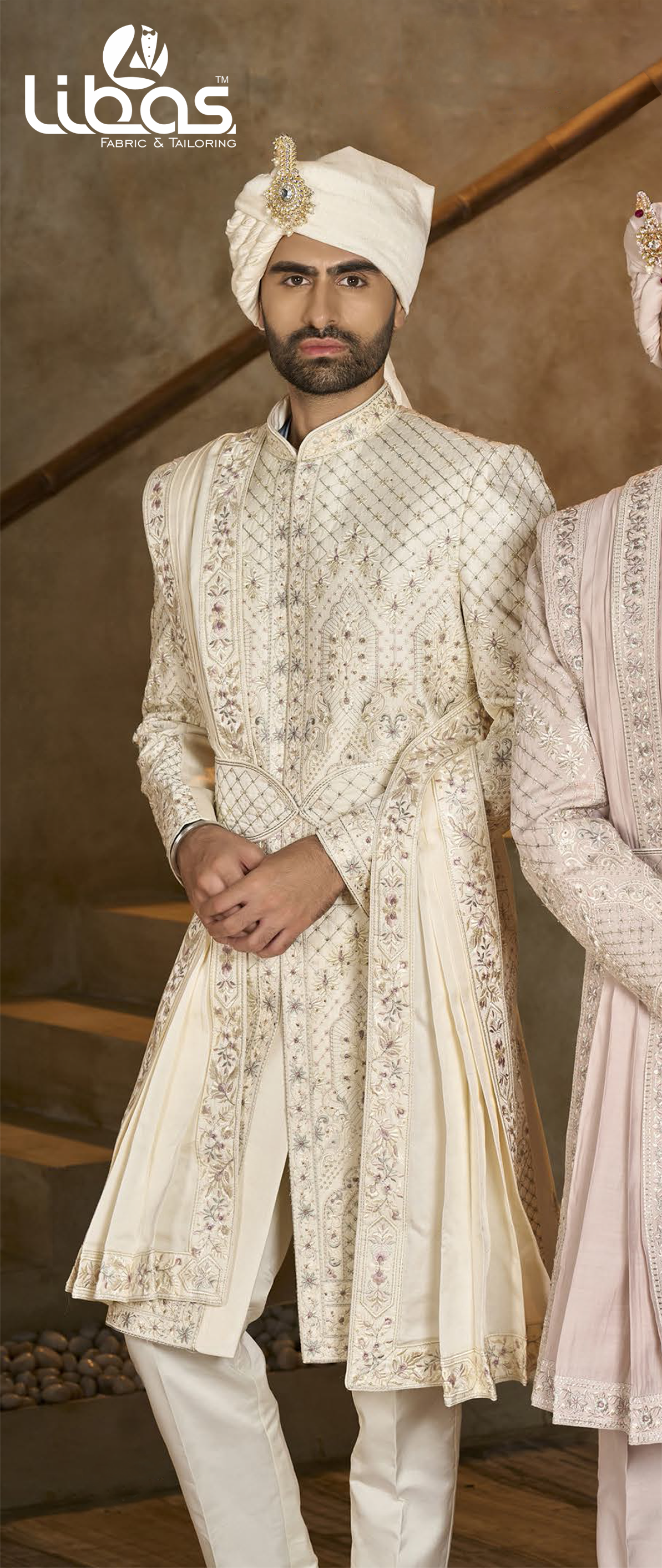 BEIGE GOLDEN SHERWANI WITH PAJAMA