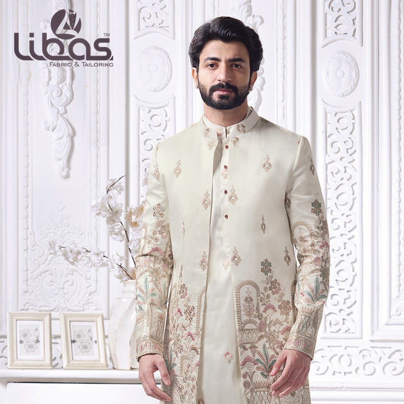 CREAM WITH PINK WORK SHERWANI BY OS...