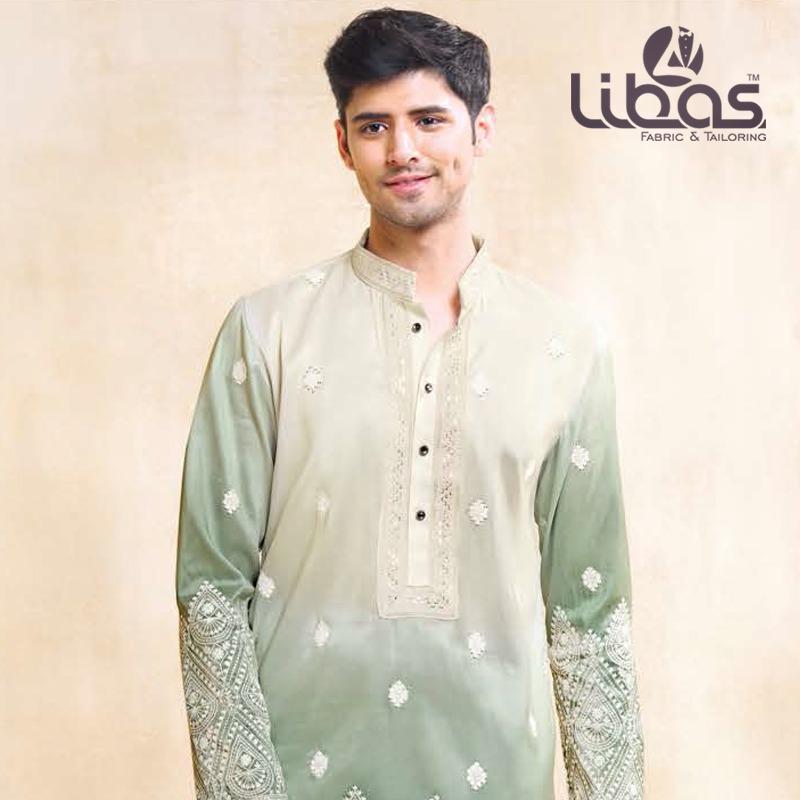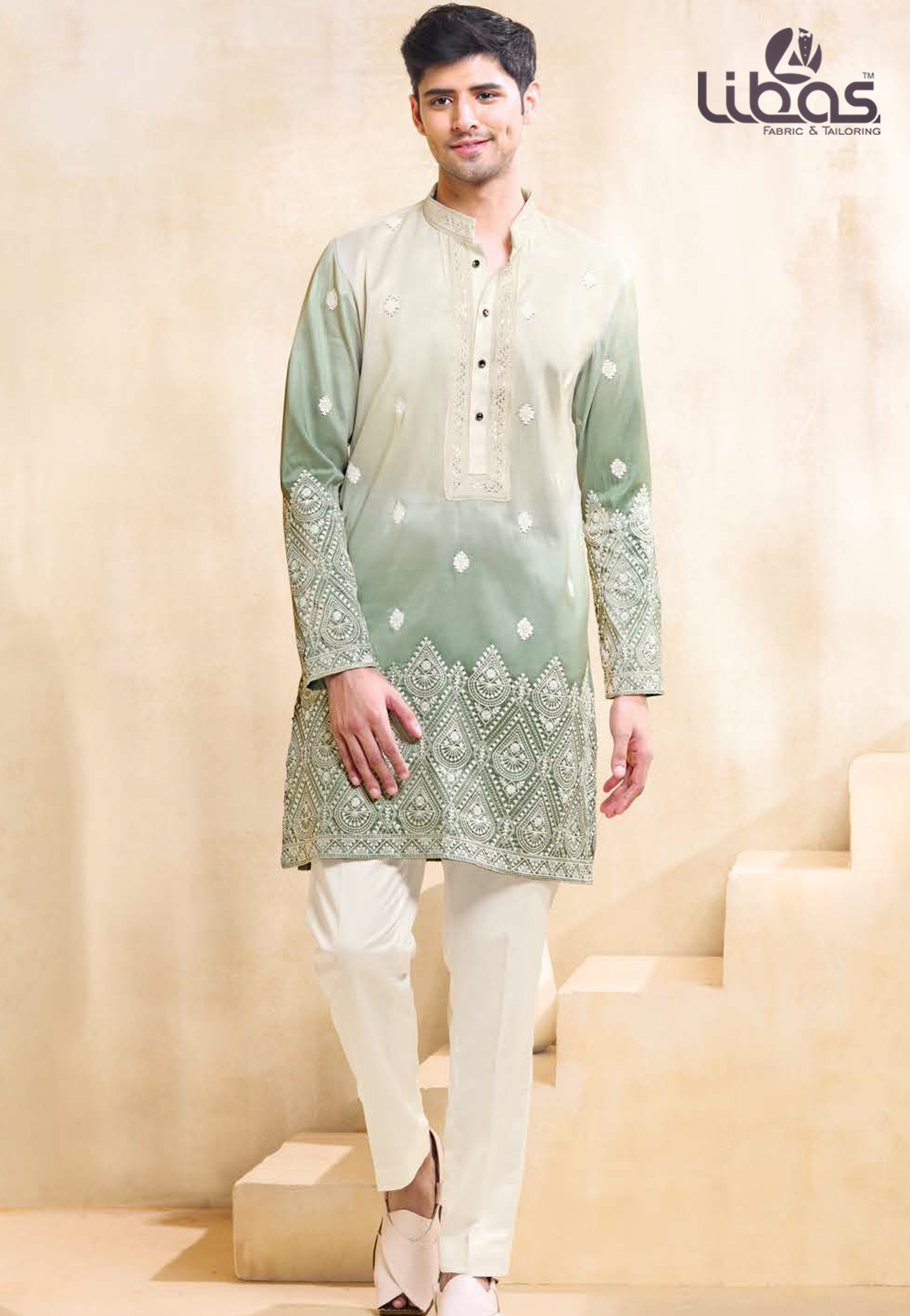 OMBRE GREEN EMBROIDERED SILK KURTA SET FOR MEN