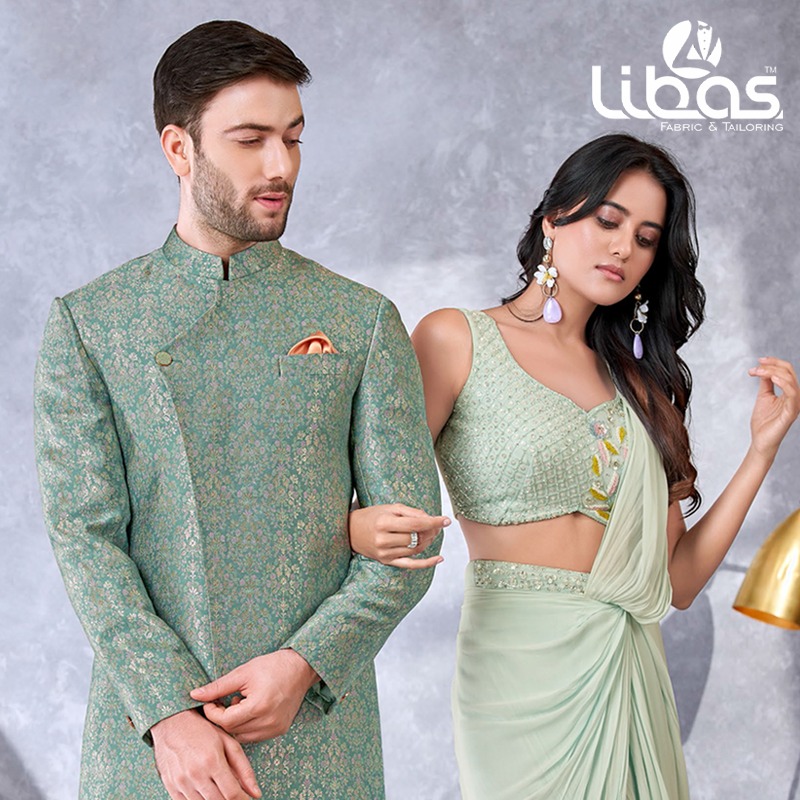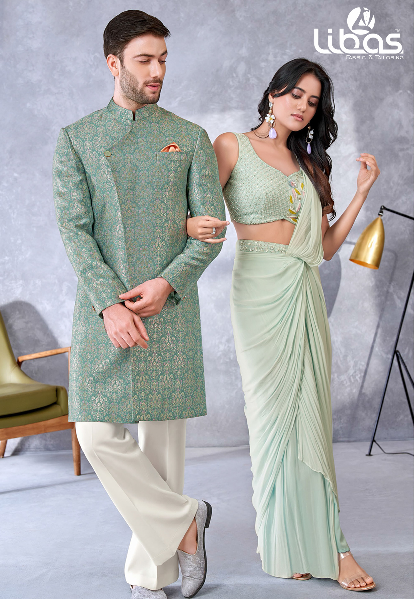 DARK CYAN STAR WORK SHERWANI WITH W...