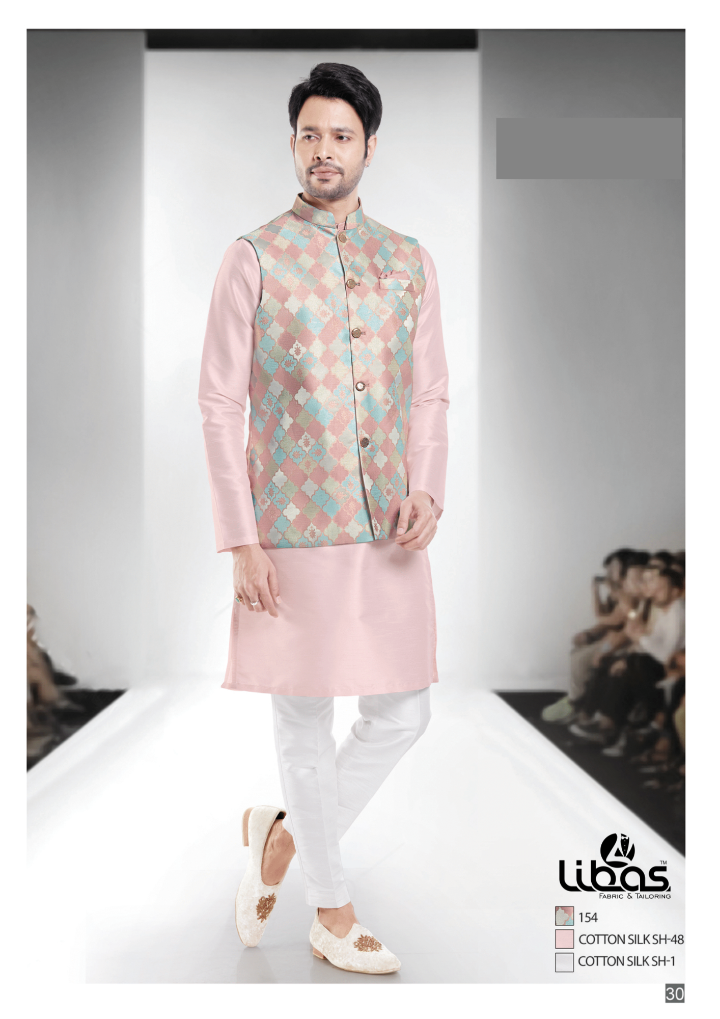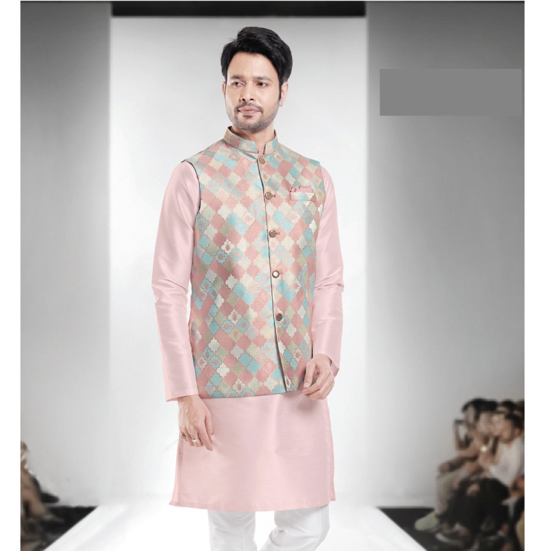 PINK CHEKSH MIX DESIGNING NEHRU KOTI WITH PINK KURTA AND WHITE PAJAMA