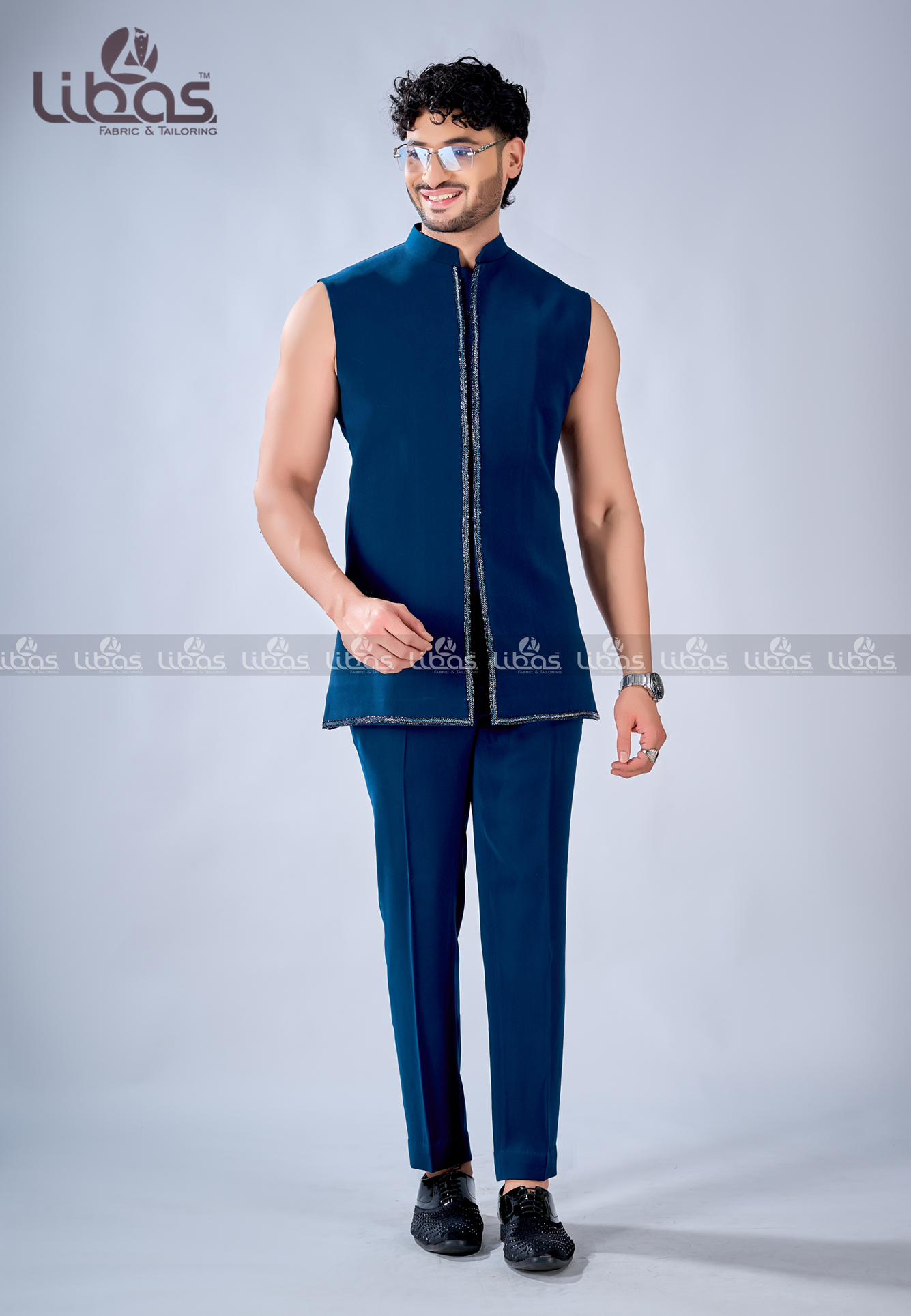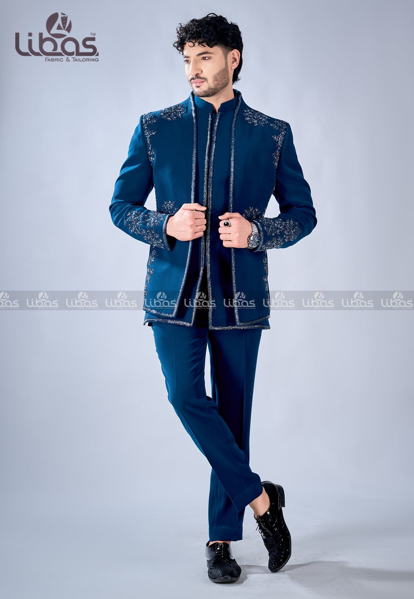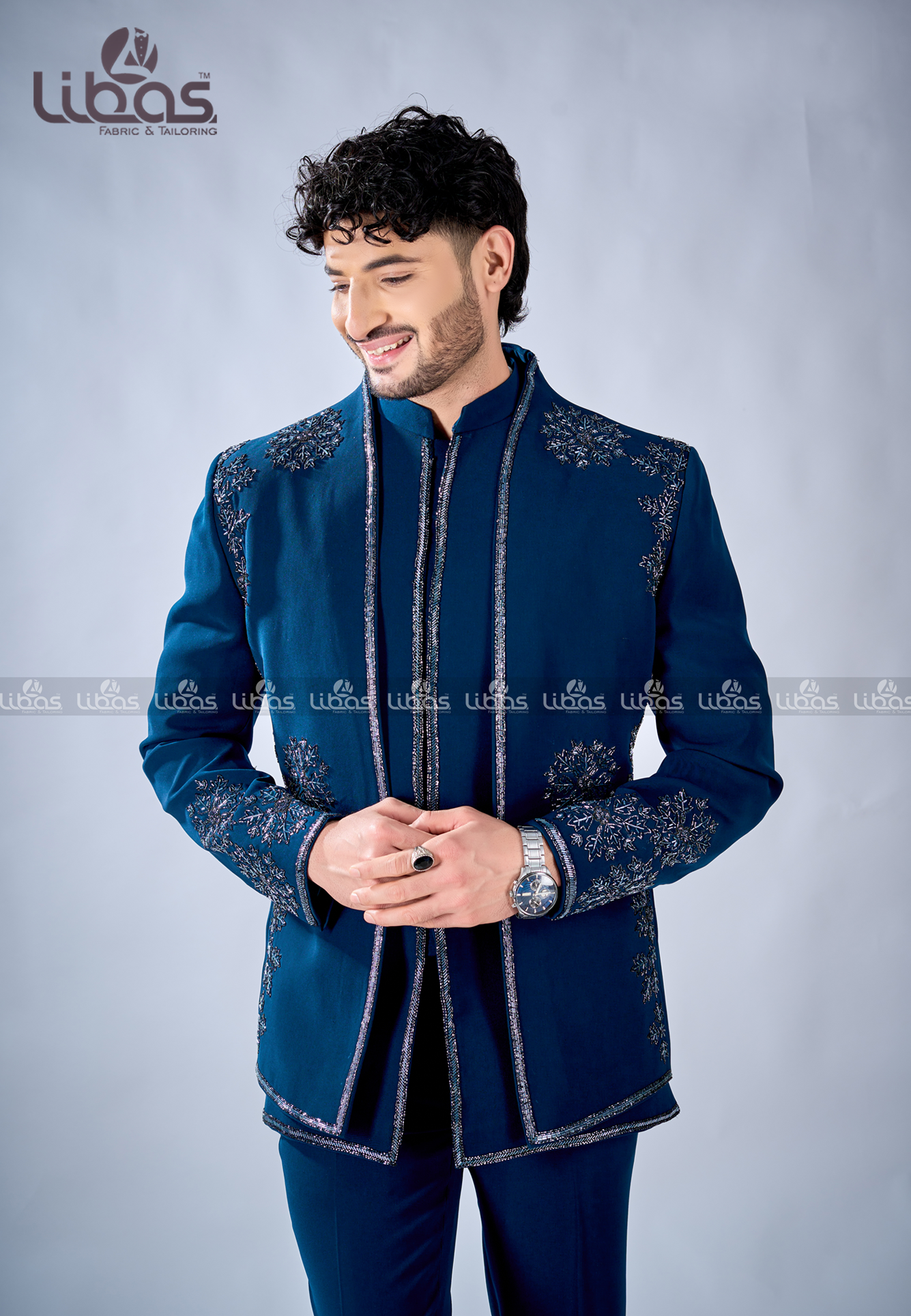 BLUE VELVET SHERWANI BY OSCON PREMI...
