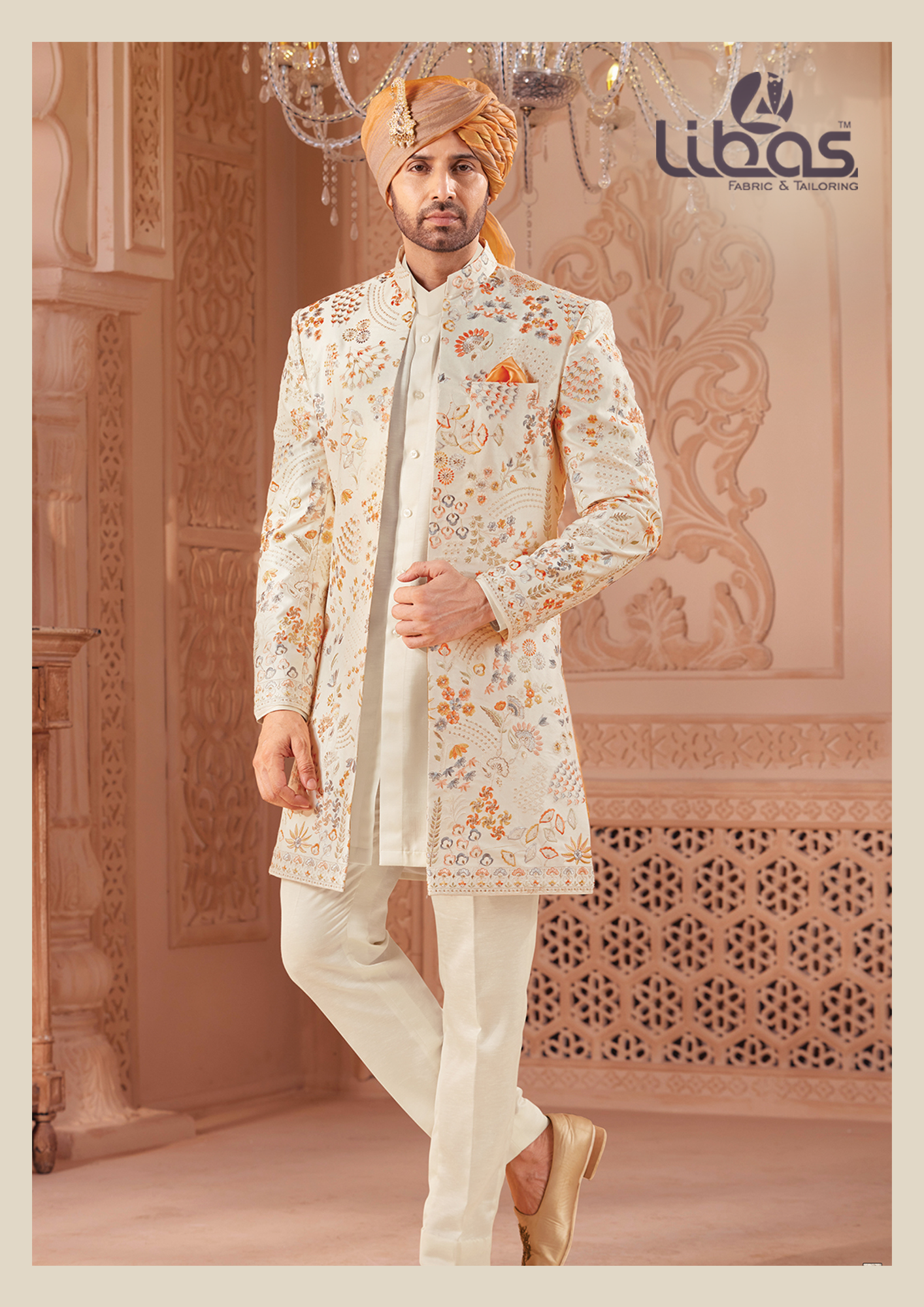 DARK CYAN STAR WORK SHERWANI WITH W...